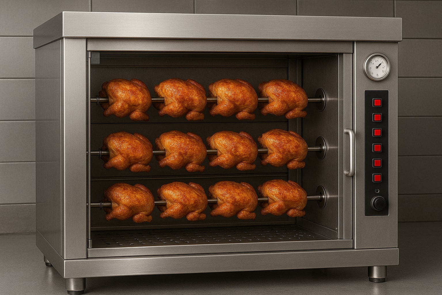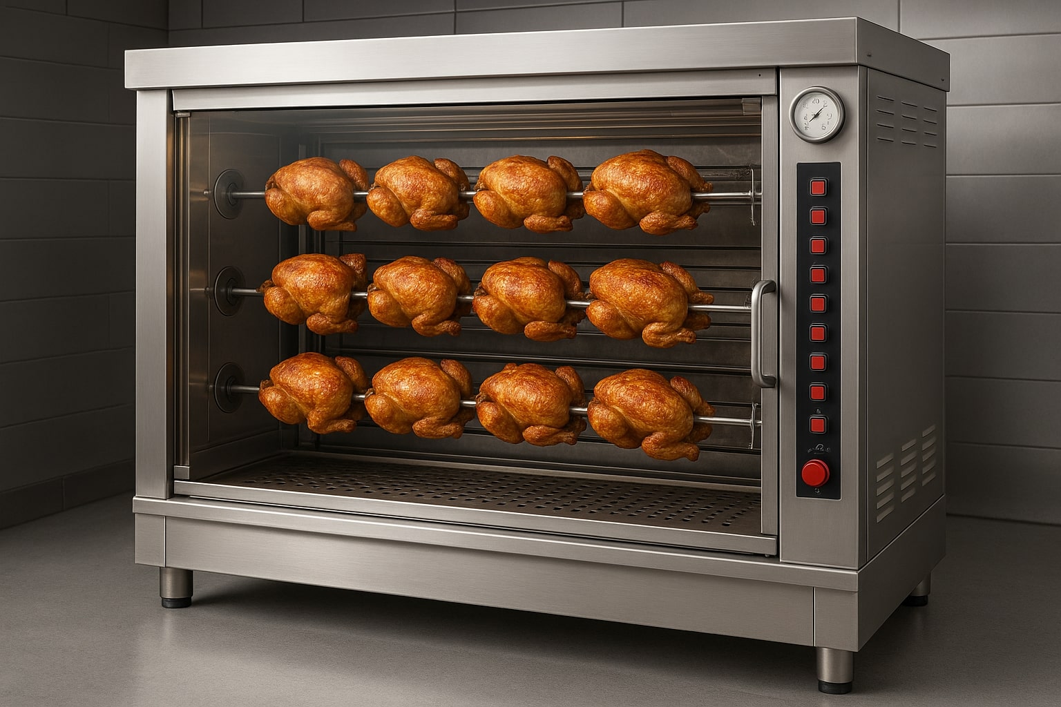 The capacity of a commercial rotisserie varies widely, and choosing the right size depends on your business model. Most professional units accommodate anywhere from 6 to 60 chickens per cycle, allowing both small cafés and large restaurants to operate efficiently. The first thing to evaluate is how many portions you need to produce during busy periods.